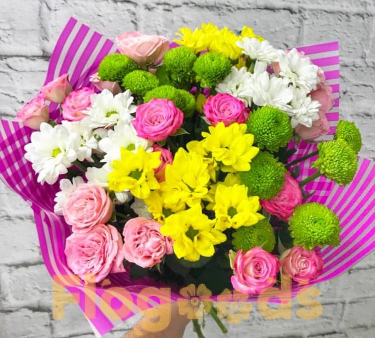 Букет «Улыбка» из солнечных роз и хирзантем- это настроение на весь день. Он заряжает позитивной энергией и положительными эмоциями.